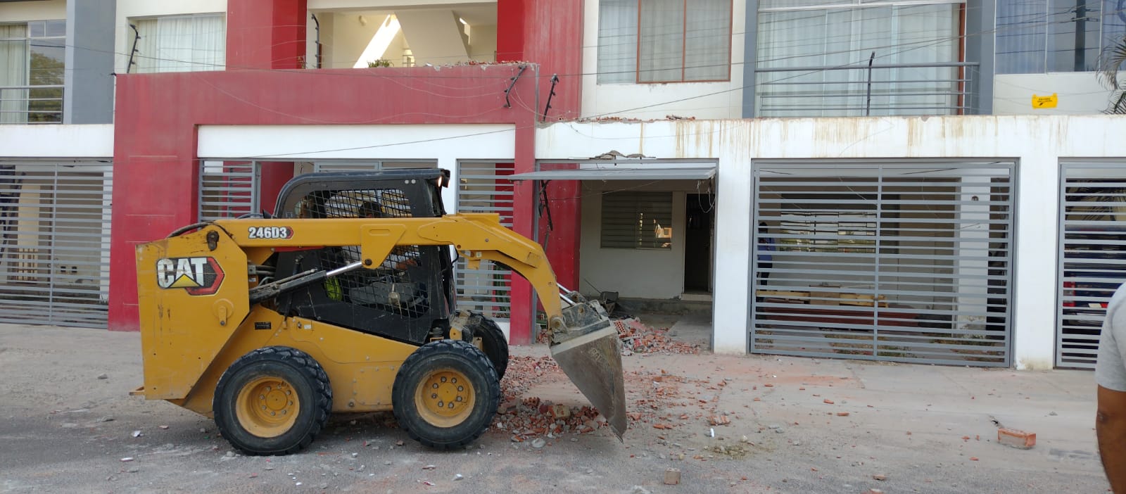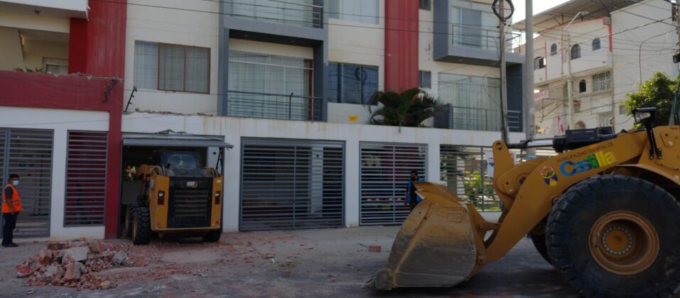 La Municipalidad de Castilla informó que en el edificio Los Jardines de Miraflores, ubicado a pocos metros del IDEPUNP, en la avenida Luis Montero, se atendió con un cargador frontal y un minicargador, debido a que las paredes que rodean la azotea cayeron y otras presentan grietas.