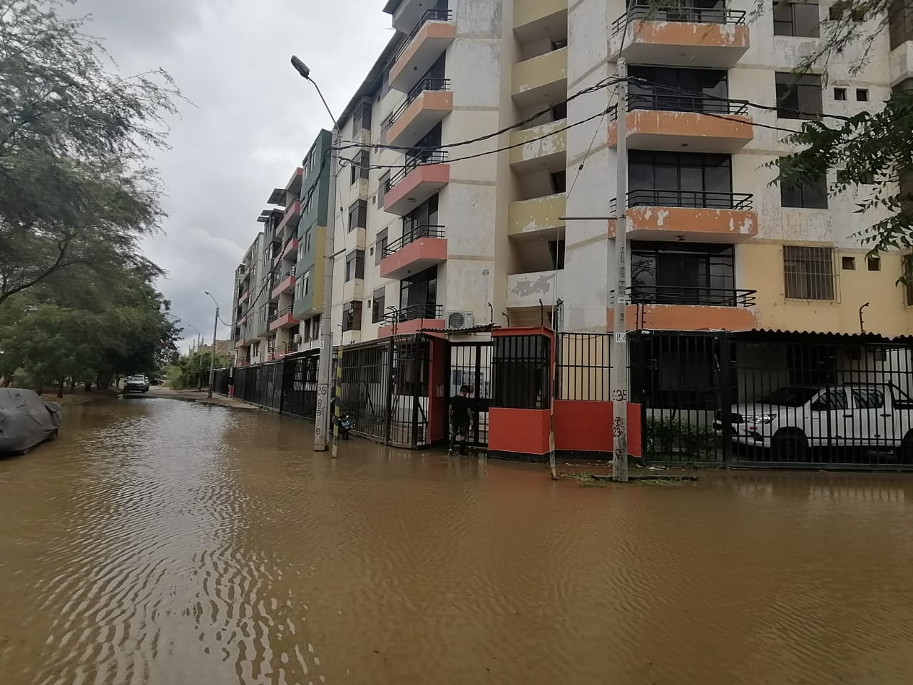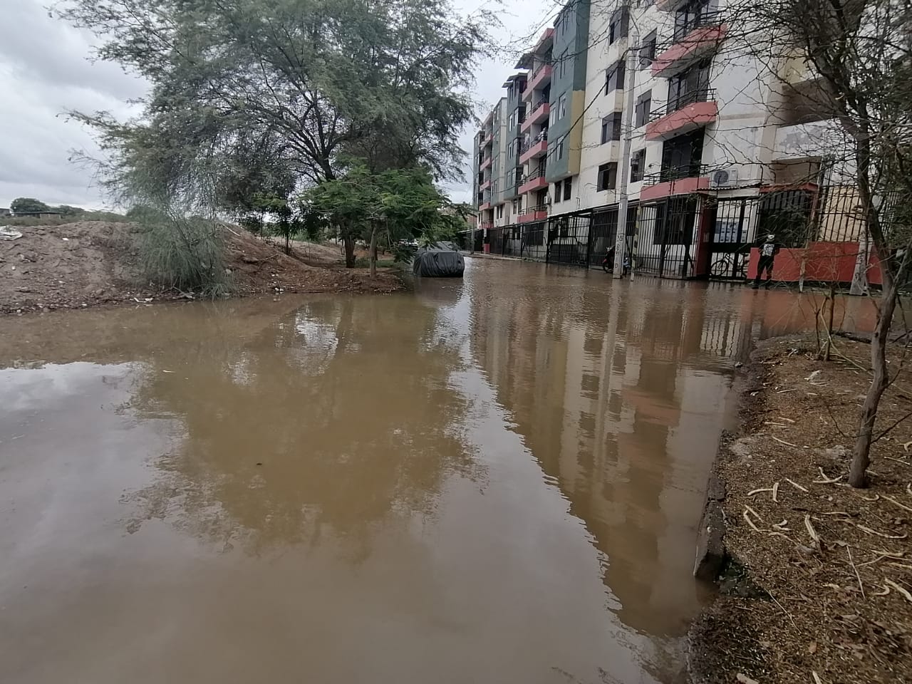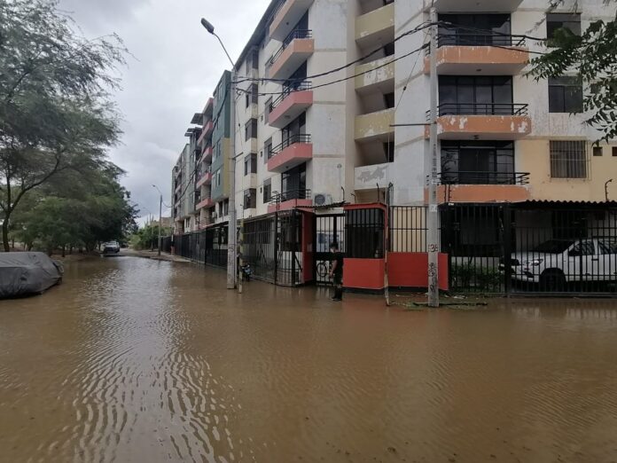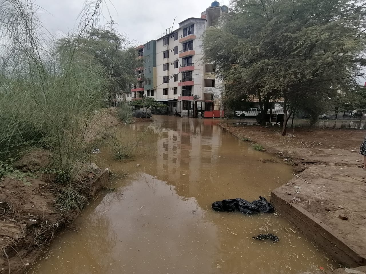 Los vecinos de la residencial Monterrico, ubicada en la urbanización Miraflores, en el distrito de Castilla, se encuentran preocupados nuevamente por la inundación de sus calles y avenidas. El edificio donde viven más de cien familias se encuentra rodeado por aguas estancadas que provienen del canal Biaggio Arbulú, el cual ha rebasado su capacidad debido a las recientes lluvias en la ciudad.