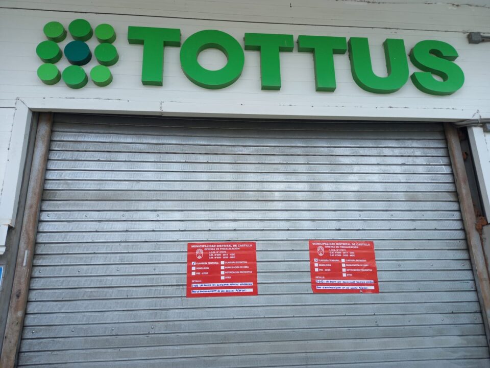 Personal de Fiscalización llegó a Tottus para realizar una inspección tras el incidente registrado en el local. Como resultado de la evaluación, se dispuso el cierre temporal del establecimiento por 48 horas, debido a la caída de baldosas, presuntamente ocasionada por las lluvias.