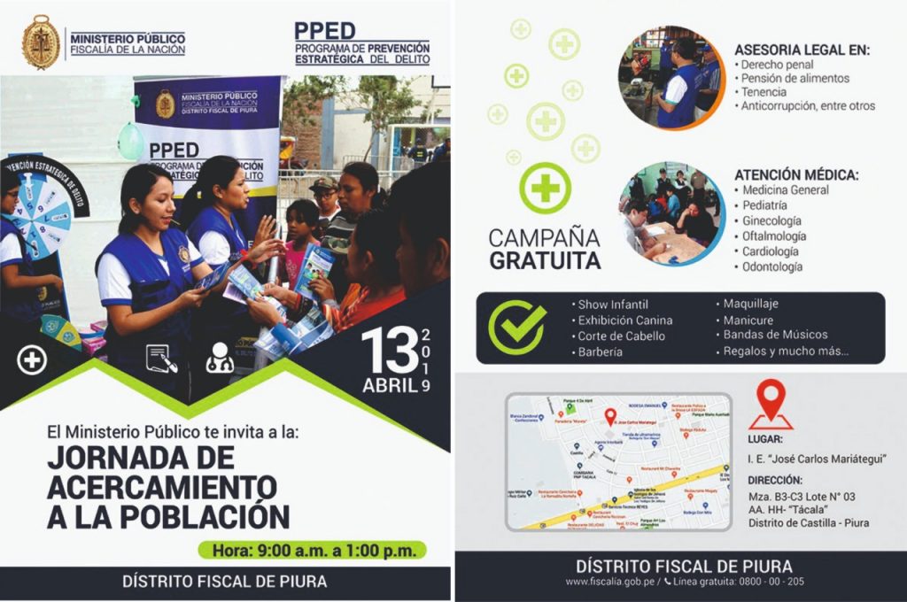 Este sábados de las 9:00 am en la institución educativa  «José Carlos Mariátegui«,  se espera la llegada de más de 1,500  pobladores en el  distrito de Castilla se beneficiarán gratuitamente con asesorías y consultas legales, atenciones en medicina general y especialidades, un vistoso show infantil y show de acrobacias caninas, así como servicios de corte cabello y barbería, entre otros.