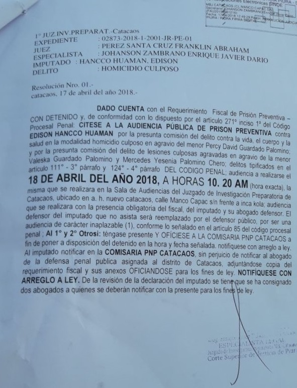La audiencia de solicitud de prisión preventiva está programada para las 10:20 de la mañana en la Sala de Audiencias del Juzgado de Investigación Preparatoria de Catacaos. El juez a cargo es el magistrado Franklin Pérez Santa Cruz