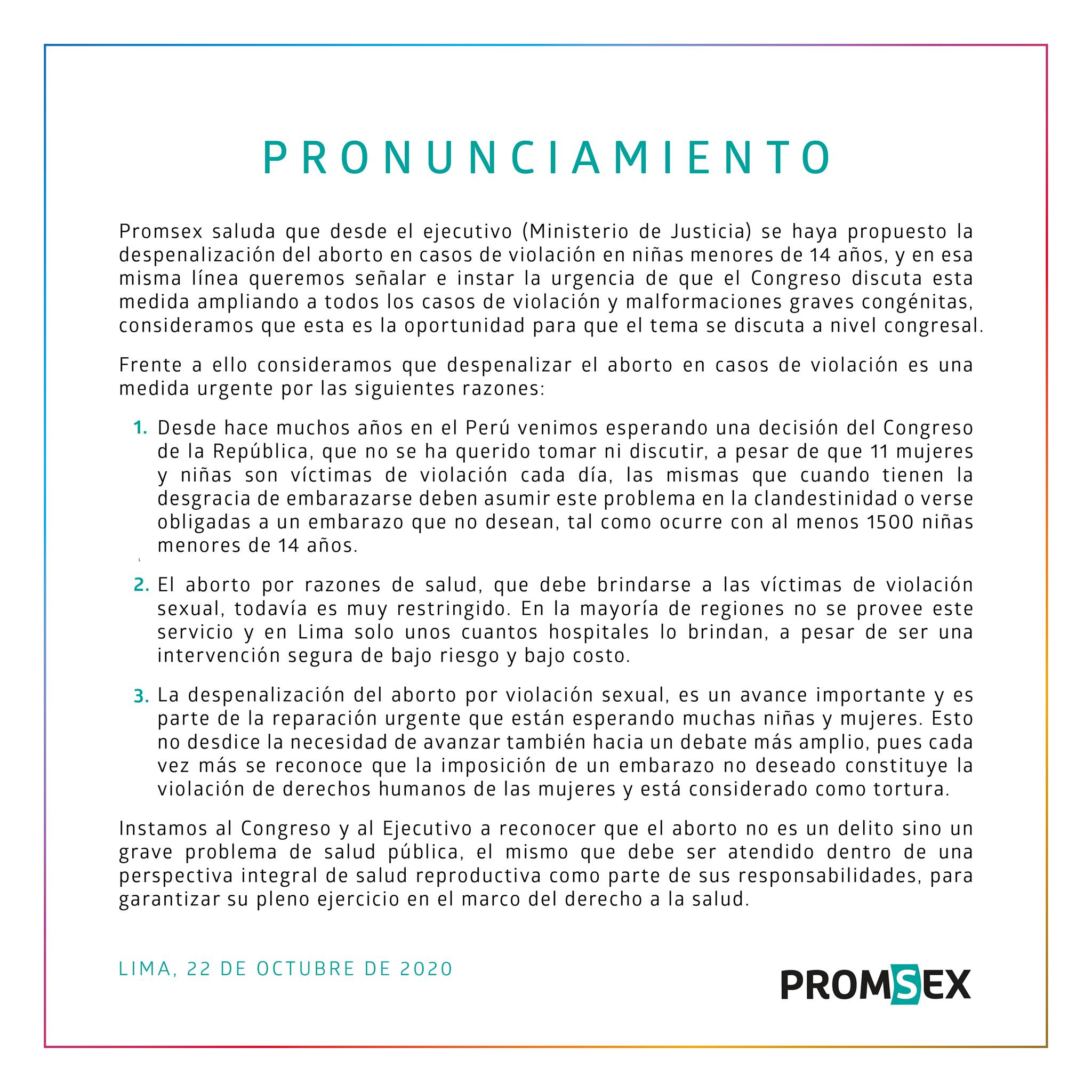 Asimismo, el Centro de Promoción y Defensa de los Derechos Sexuales y Reproductivos – Promsex, emitió un comunicado en apoyo a la iniciativa de la ministra de Justicia.