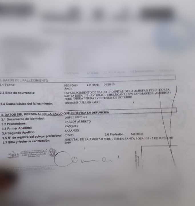 Cutivalú tuvo acceso al certificado de defunción de la joven de 22 años del distrito de Veintiséis de Octubre que fue reportada por la Dirección regional de salud de Piura como una de las dos personas fallecidas a causa de este síndrome. En el, se señala que la mujer falleció el pasado 5 de junio a causa de Guillain Barré.