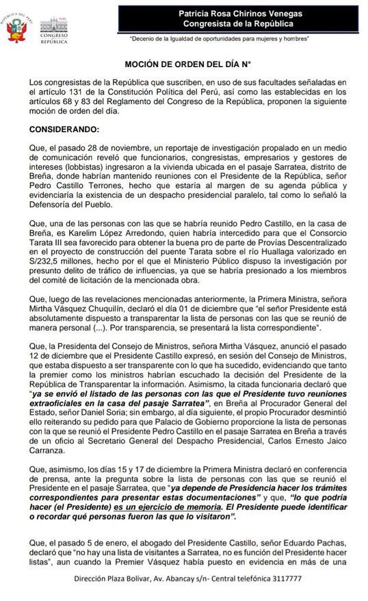 “He presentado una moción para que la Premier Mirtha Vásquez asista inmediatamente al Congreso y rinda cuentas al país sobre la lista de nombres que se reunieron clandestinamente con Pedro Castillo en la casa de Breña, toda vez que el despacho presidencial está adscrito a la Presidencia del Consejo de Ministros”, se lee en el Twitter de la congresista.