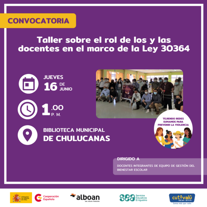 Este 16 de junio se inician las capacitaciones con docentes de Tutoría de 20 instituciones educativas de la provincia de Morropón. Este primer taller tratará sobre la Ley 30364 y las responsabilidades funcionales que tiene el cuerpo docente en el marco de esta ley para prevenir, erradicar y sancionar la violencia contra la mujer e integrantes del grupo familiar.