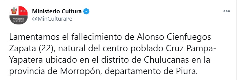 A través de un comunicado en sus redes sociales, el Ministerio de Cultura expresó sus condolencias por el fallecimiento de Alonso Cienfuegos Zapata (22), quien este 11 de enero perdió la vida mientras realizaba el mantenimiento de unas turbinas de la planta de empaque perteneciente a la empresa agrícola Saturno S.A., ubicada en el caserío Sol Sol, del distrito de Chulucanas.