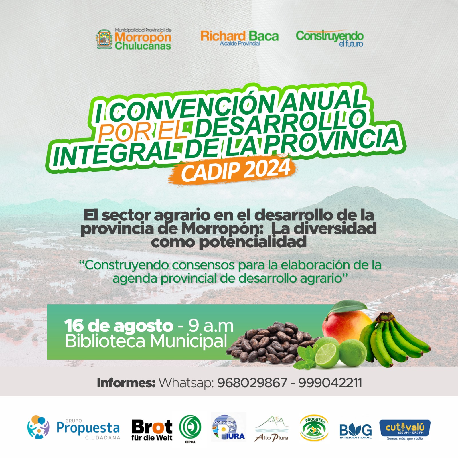 El próximo viernes 16 de agosto se llevará a cabo la I Convención Anual por el Desarrollo Integral de la Provincia (CADIP) 2024, en la biblioteca municipal de Chulucanas, en Morropón. En este se abordará como tema principal “El sector agrario en el desarrollo de la provincia de Morropón: la diversidad como potencialidad”.