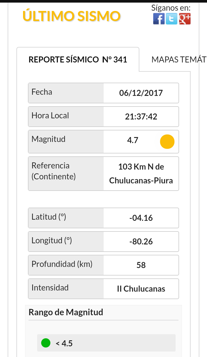 Según el Instituto Geofísico del Perú (IGP), el movimiento telúrico ocurrió a las 9:37 de la noche y el epicentro se registró a 103 km al Norte de Chulucanas.