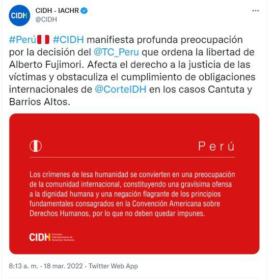 “La Comisión Interamericana de Derechos Humanos manifiesta su profunda preocupación por la decisión del Tribunal Constitucional que ordena la libertad de Alberto Fujimori. Afecta el derecho a la justicia de las víctimas y obstaculiza el cumplimiento de obligaciones internacionales de la Corte Interamericana de Derechos Humanos en los casos Cantuta y Barrios Altos”, se lee en un mensaje difundido en la cuenta de Twitter de la CIDH.