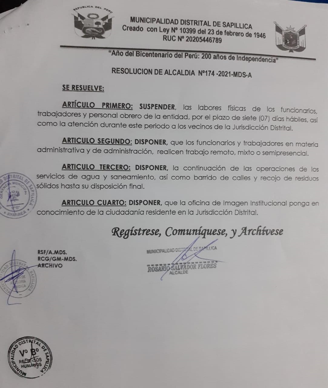 Por ello, mediante una resolución de alcaldía, se aprobó cerrar temporalmente la Municipalidad por siete días para salvaguardar la salud de sus trabajadores y de la población en general. La atención a los trámites es de manera virtual hasta este jueves 13 de mayo que se cumple el periodo de cierre.