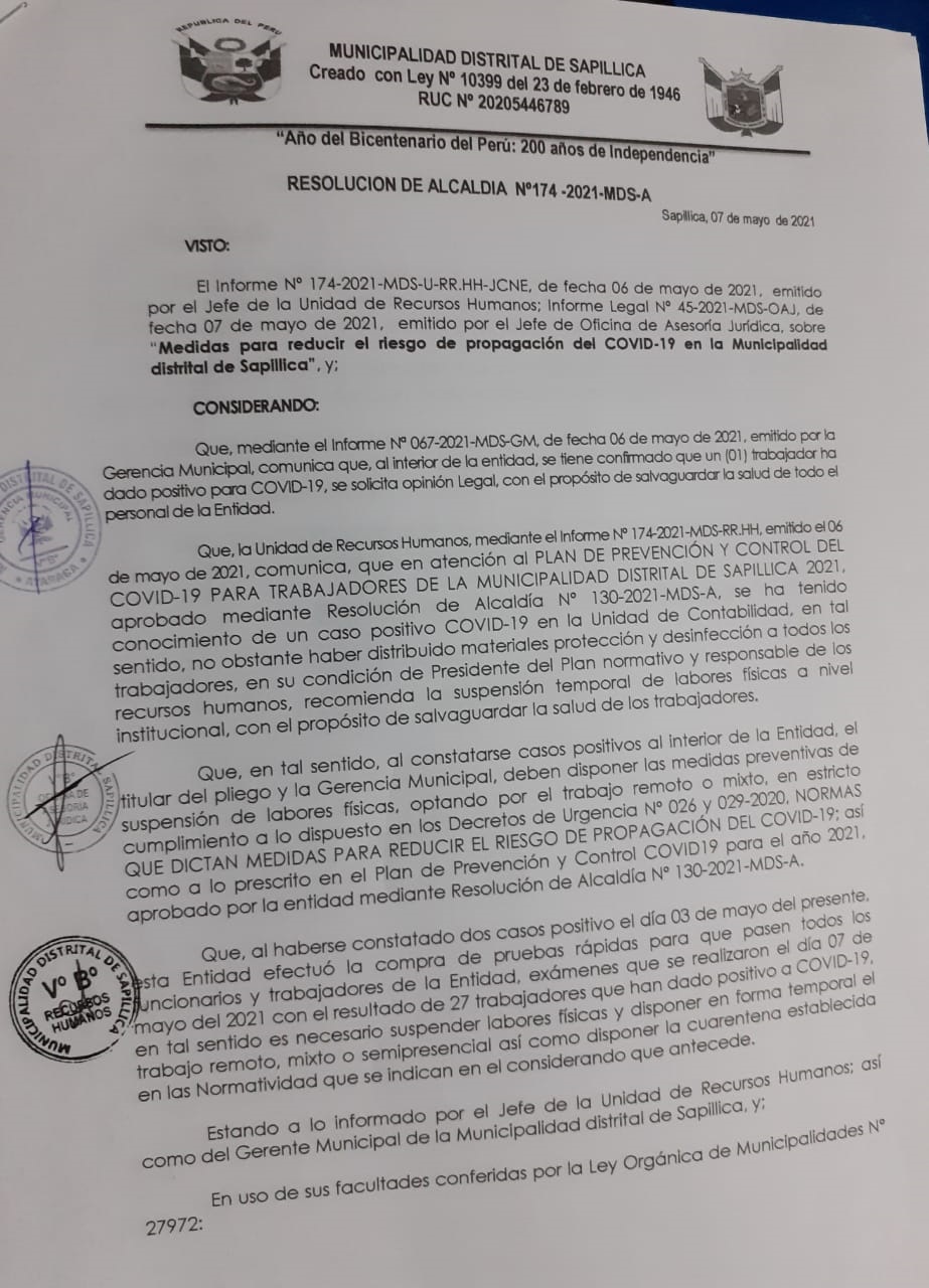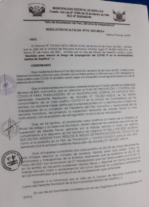 Tras haberse detectado un caso positivo de covid-19 en la Municipalidad Distrital de Sapillica (Ayabaca), el jueves 06 de mayo se aplicaron pruebas rápidas de descarte a todos los trabajadores de esta institución y se detectó un total de 27 casos positivos.