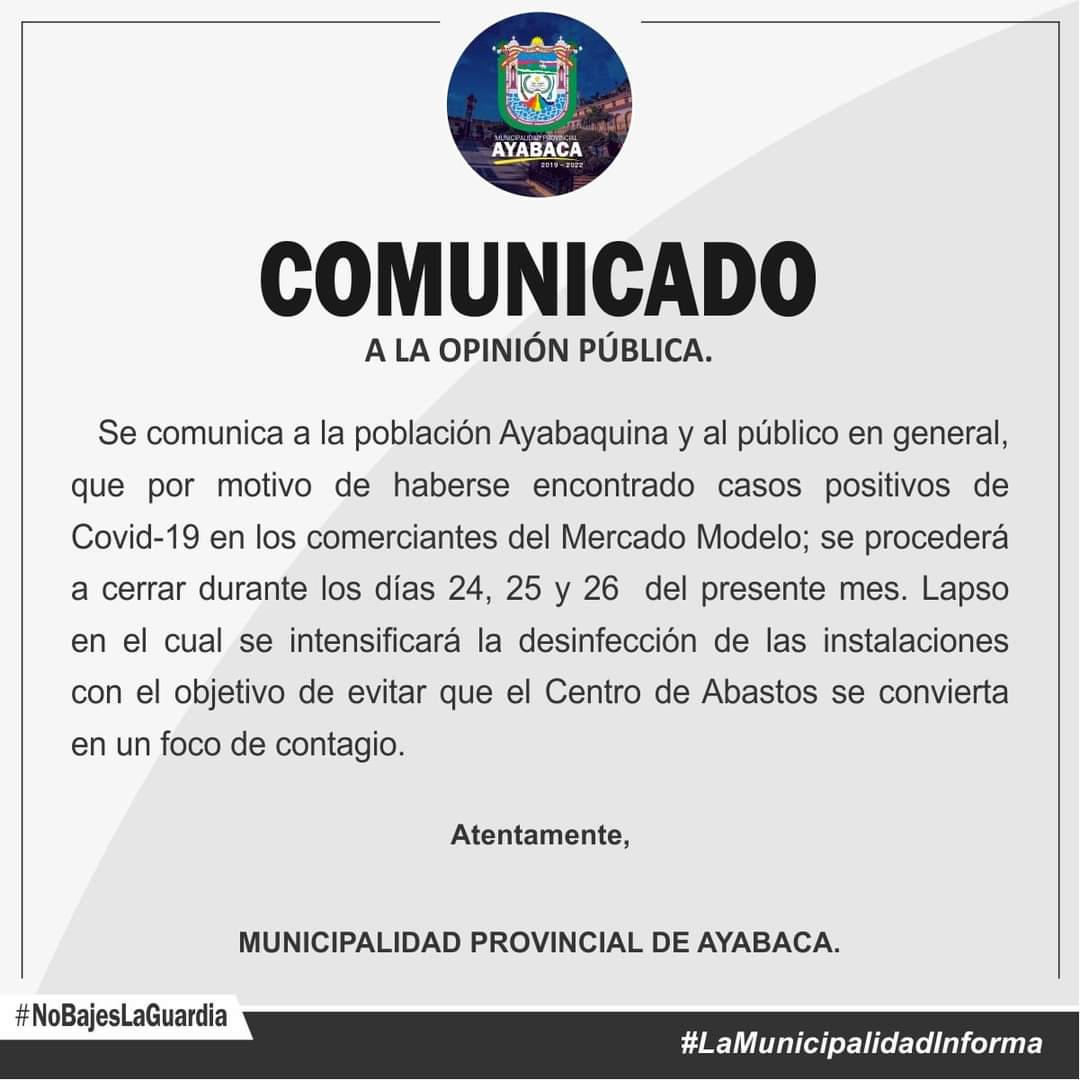 La Municipalidad Provincial de Ayabaca informó mediante un comunicado en sus redes sociales, que por motivo de haber encontrado casos positivos de covid-19 en los comerciantes del Mercado Modelo, el centro de abastos estará cerrado los días 24, 25 y 26 de febrero.