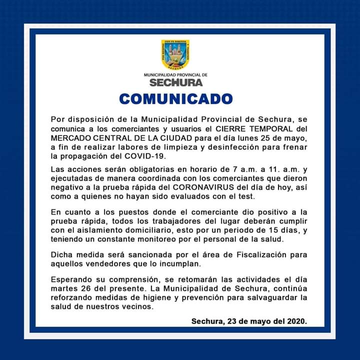 Luego de conocerse que de 265 pruebas rápidas realizadas a comerciantes del mercado de Sechura, 70 de ellos dieron positivo a COVID-19, la municipalidad provincial ha dispuesto el cierre de este mercado desde este lunes con la finalidad de realizar tareas de limpieza y desinfección de toda el área  y puestos de venta.