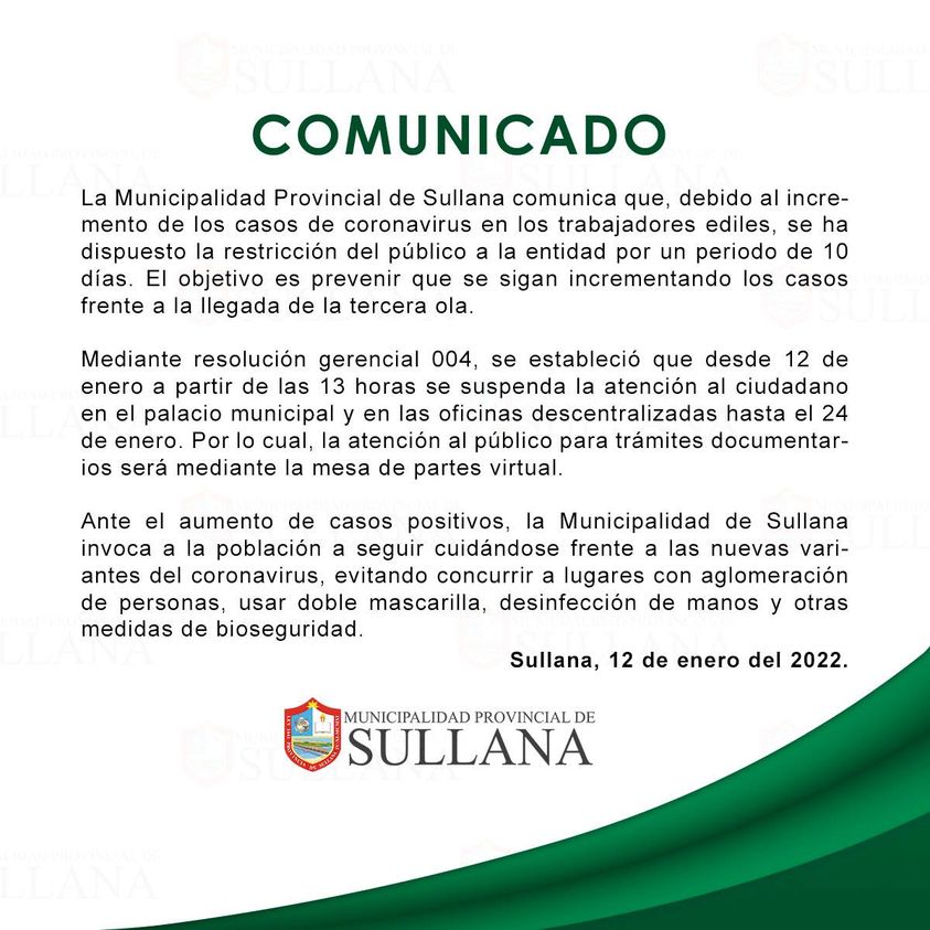 La Municipalidad Provincial de Sullana comunicó que suspenderá la atención al público de manera temporal por diez días debido al aumento de trabajadores contagiados.