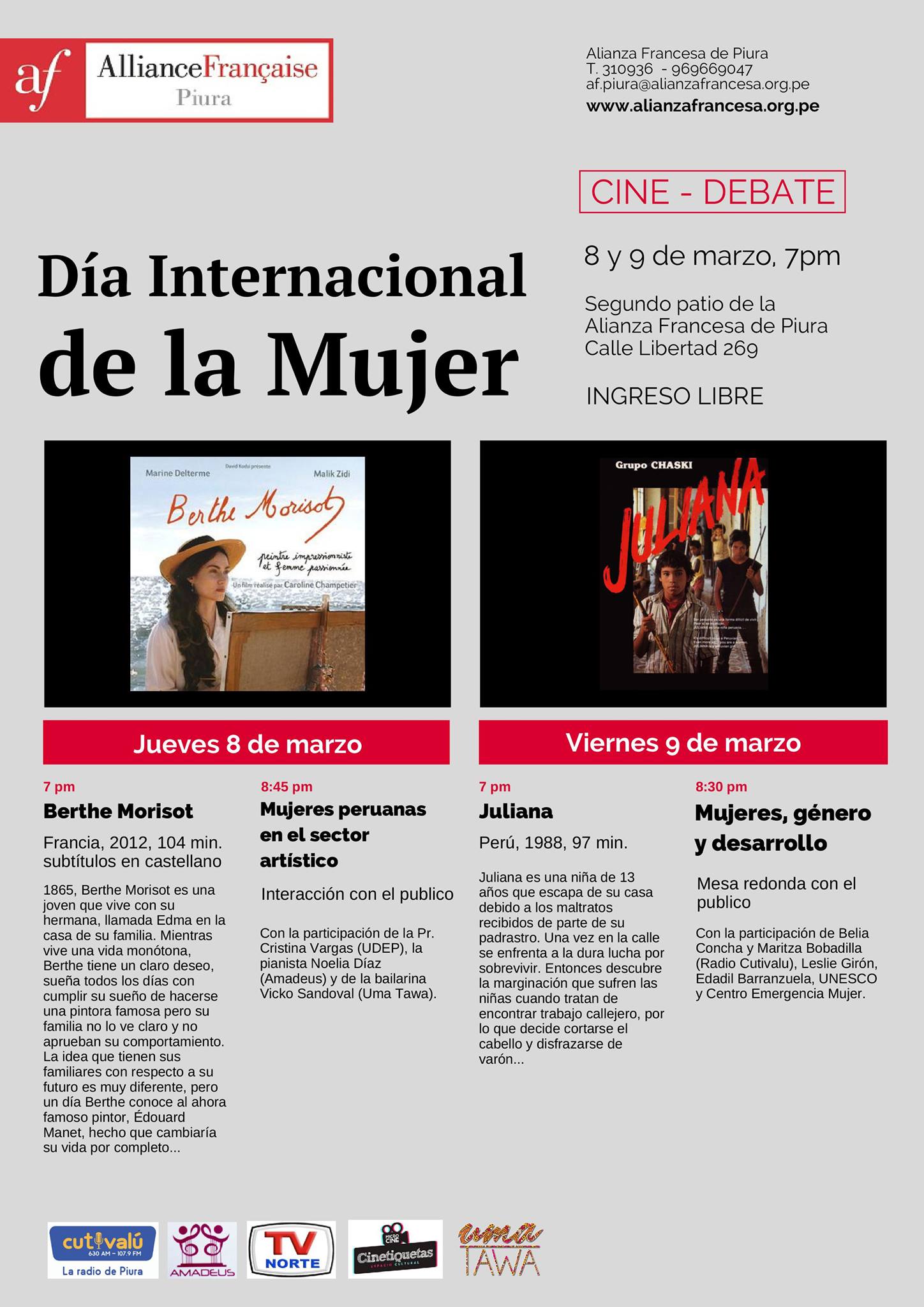 Con un ciclo de cine y debates durante dos noches, la Alianza Francesa de Piura celebrará el Día Internacional de la Mujer.