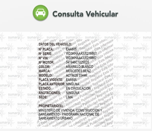 Cutivalú corroboró que la cisterna de placa EAA605 es de propiedad del Ministerio de Vivienda, Construcción y Saneamiento – Programa Nacional de Saneamiento Urbano, según los registros de Sunarp.