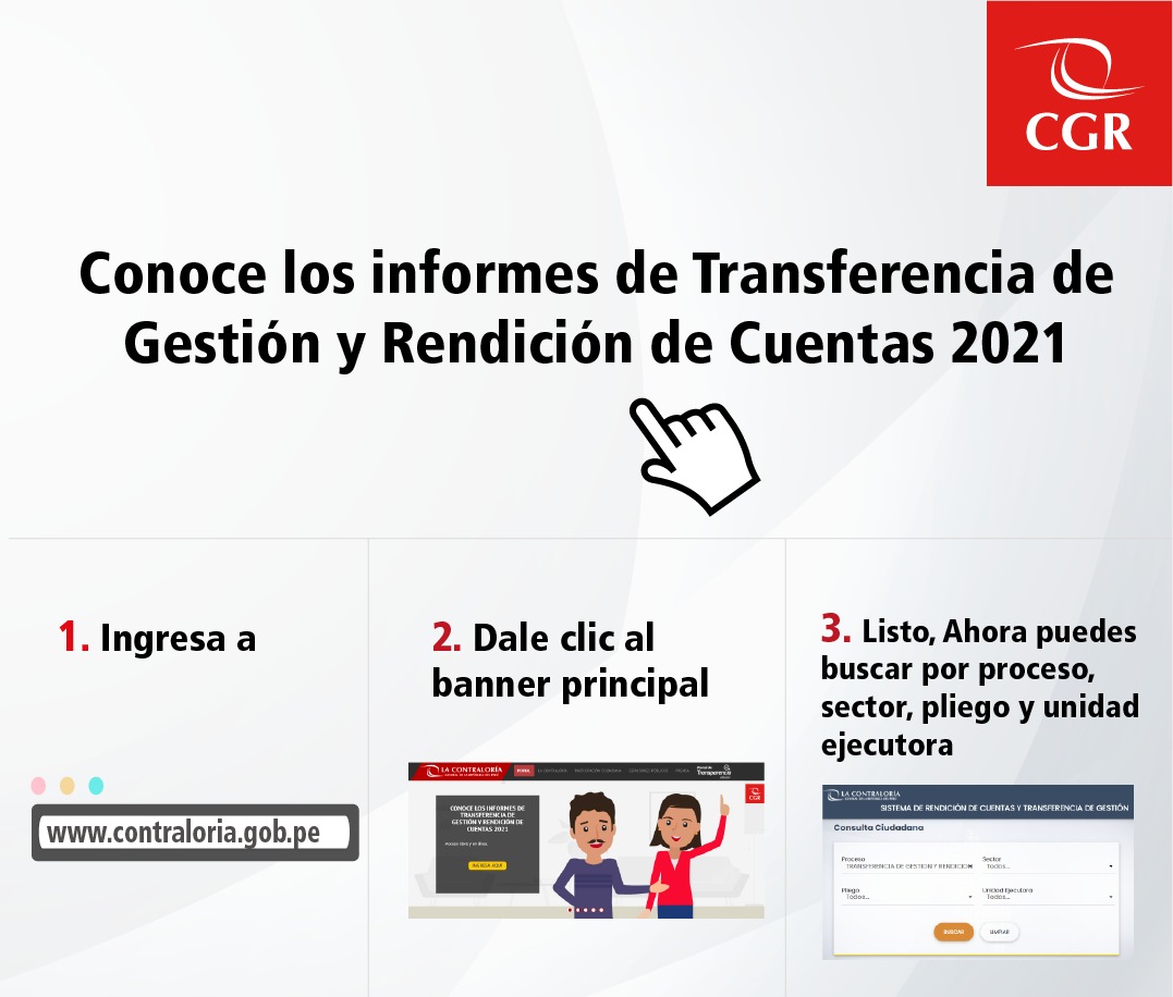Para promover el control social, la Contraloría General pone por primera vez a disposición de los ciudadanos los Informes de Transferencia de Gestión y Rendición de Cuentas de Titulares del Gobierno Nacional, que contienen la información de las autoridades salientes del Poder Ejecutivo y el Congreso de la República sobre el uso de los recursos y bienes públicos, el estado situacional de su gestión, así como los logros y asuntos urgentes de prioritaria atención para las nuevas autoridades, presentados por cambio de gobierno, y comprende a los poderes Ejecutivo y Legislativo.