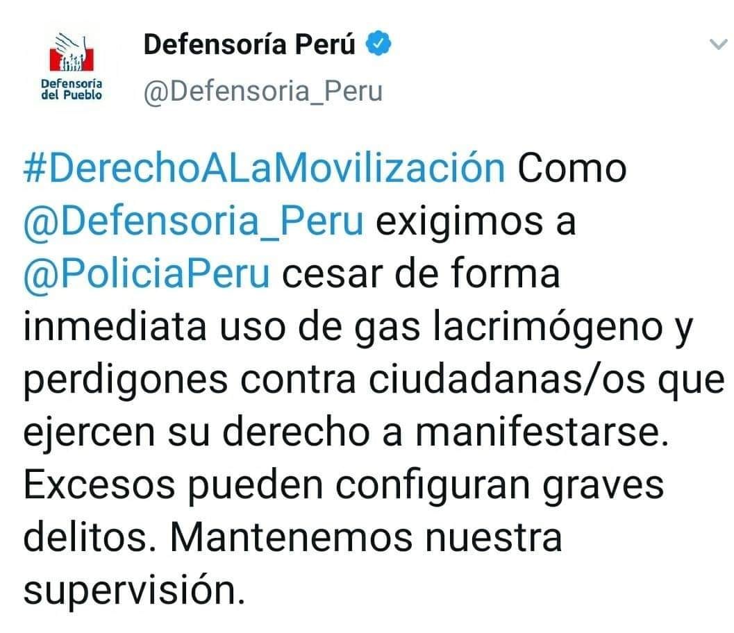 La Defensoría del Pueblo también se pronuncia y exige a la Policía no usar gas lacrimógeno y perdigones contra los ciudadanos que ejercen su derecho a protestar. “Excesos pueden configurar graves delitos. Mantenemos nuestra supervisión”, añaden a través de las redes sociales.
