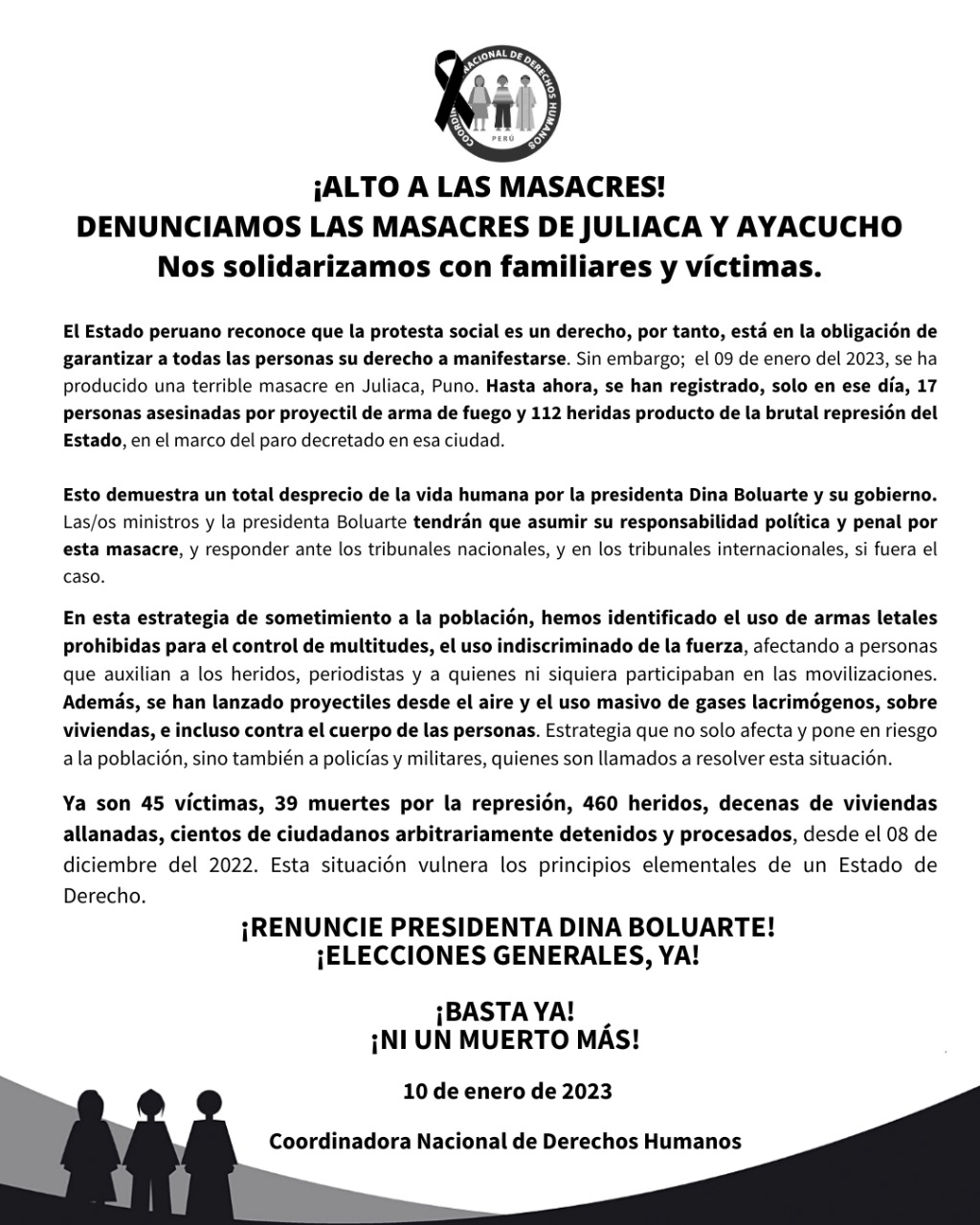 A través de un pronunciamiento, la Coordinadora Nacional de Derechos Humanos exige la renuncia de la presidenta de la república Dina Boluarte Zegarra y la convocatoria a elecciones inmediatas.
