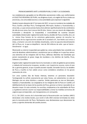 Frente a esta situación las organizaciones sociales de toda la región reunidas en el Colectivo Regional de Piura emitieron un pronunciamiento para mostrar su indignación hacia las autoridades por las “medidas desatinadas”, que según consideran, significa un gasto de dinero en vano.
