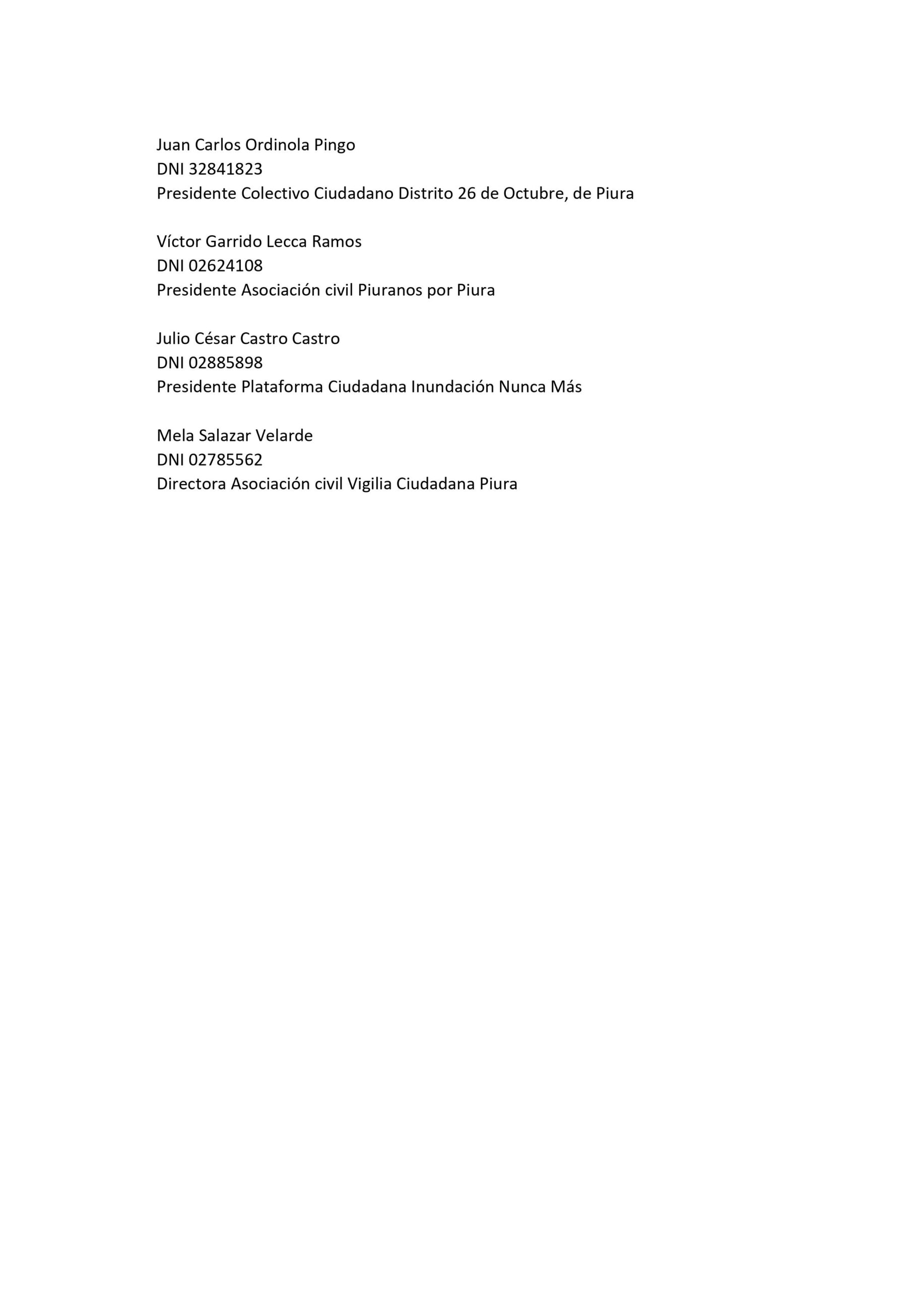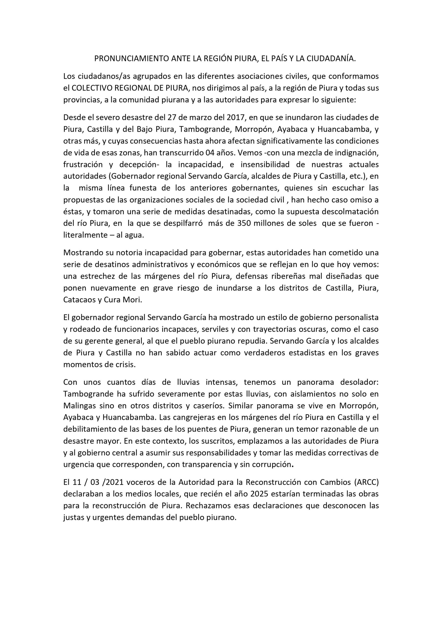 “Mostrando su notoria incapacidad para gobernar, estas autoridades han cometido una serie de desatinos administrativos y económicos que se reflejan en lo que hoy vemos: una estrechez de las márgenes del río Piura, defensas ribereñas mal diseñadas que ponen nuevamente en grave riesgo de inundarse a los distritos de Castilla, Piura, Catacaos y Cura Mori”, se lee en el documento.