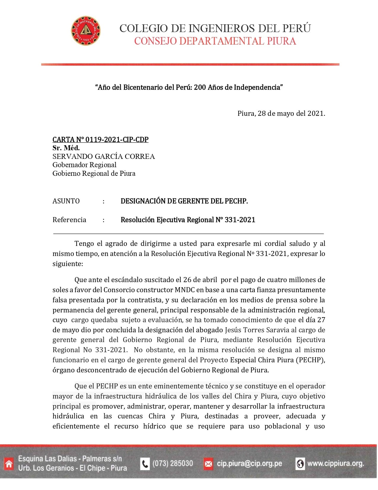 Mediante la carta 119 dirigida al gobernador Servando García, el Colegio de Ingenieros advierte que Jesús Torres Saravia no es ingeniero, por lo que “no podría desempeñar funciones técnicas y administrativas en el operador mayor de la infraestructura hidráulica de los valles del Chira y Piura, y podría afectar a la población”, se agrega en el documento.