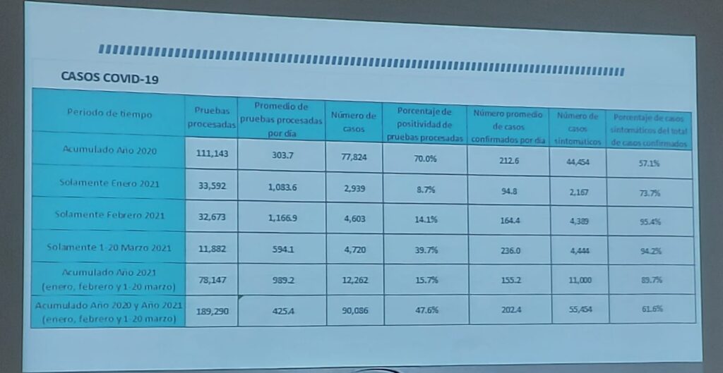 Barrena Dioses señaló que, a diferencia del año pasado donde la mayoría de contagiados eran asintomáticos, es decir no presentaban síntomas, en este 2021 la cantidad de pacientes sintomáticos ha aumentado. En enero, el 74% de las personas muestreadas presentaba síntomas de la enfermedad, y para febrero y marzo, lo son el 95 y 94% de los pacientes. Para el Colegio Médico, estos cambios genera la sospecha de la presencia de una nueva variante de covid en la región.