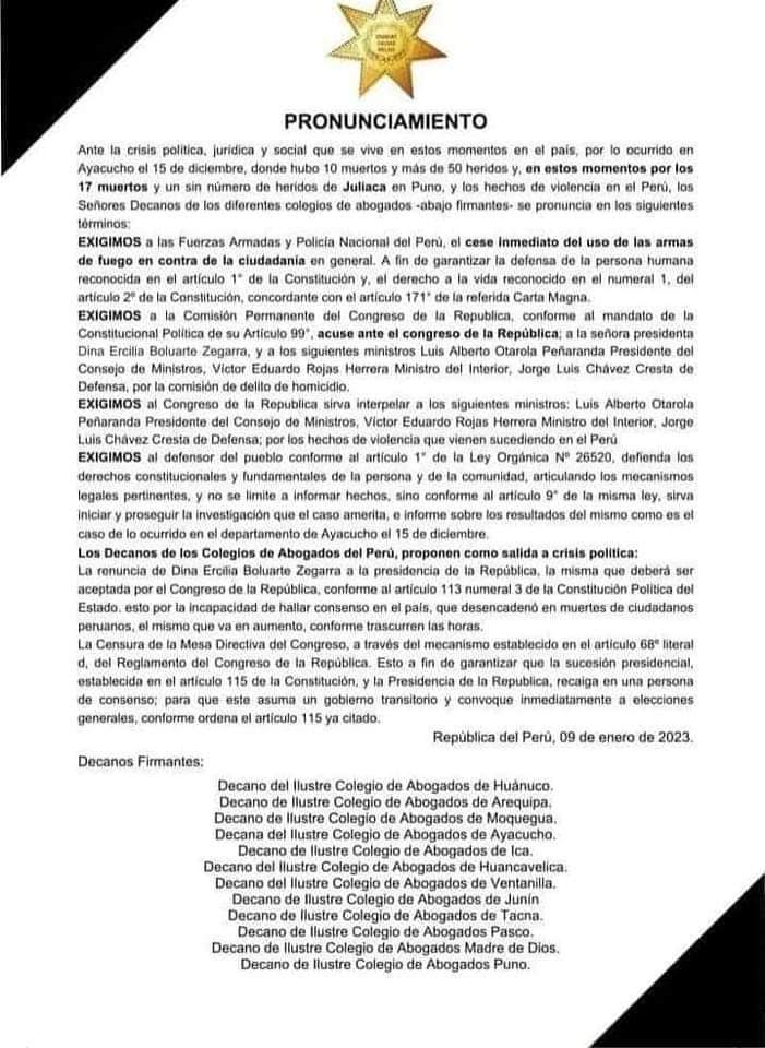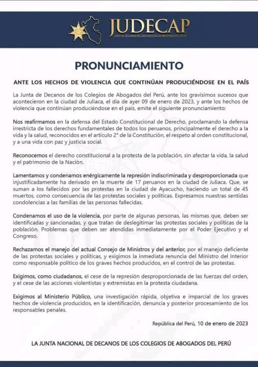 Por su parte, la Junta de Decanos de los Colegios de Abogados del Perú también se pronunció debido a la ola de violencia en el país. De esta forma, lamentaron la “represión indiscriminada y desproporcionada que injustificadamente ha derivado en la muerte de 17 peruanos en la ciudad de Juliaca”.