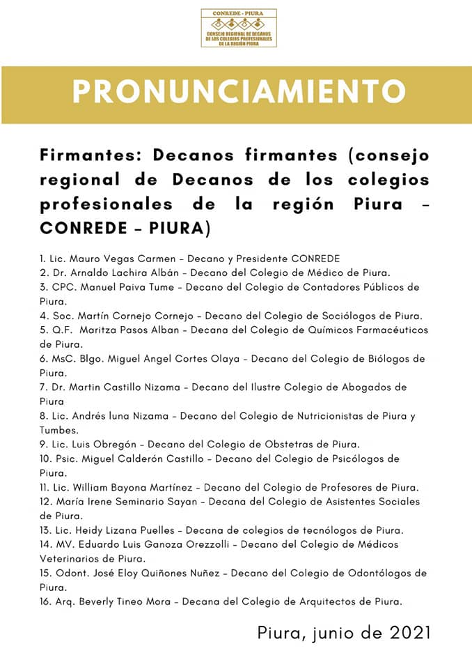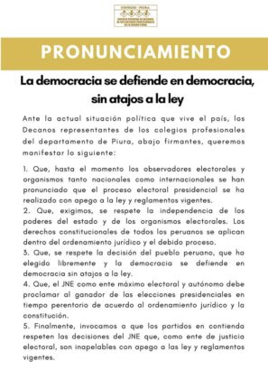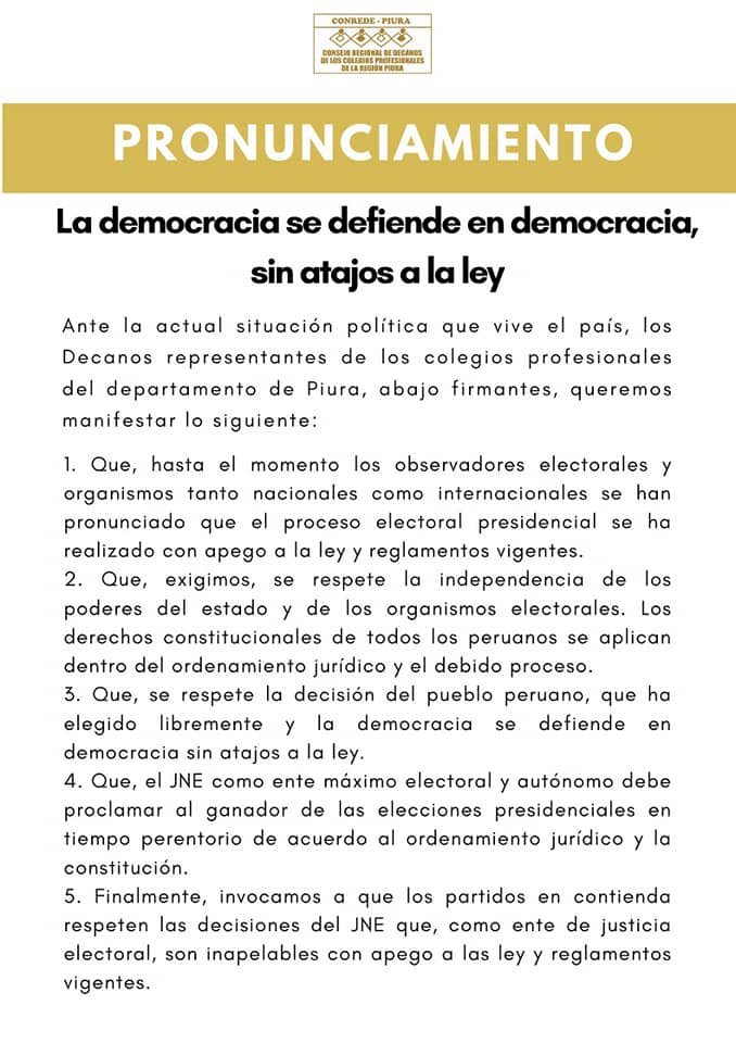 El Consejo Regional de Decanos de los Colegios profesionales (CONREDE) de Piura publicaron un comunicado en que resaltan que la democracia se defiende en democracia, sin atajos a la ley.