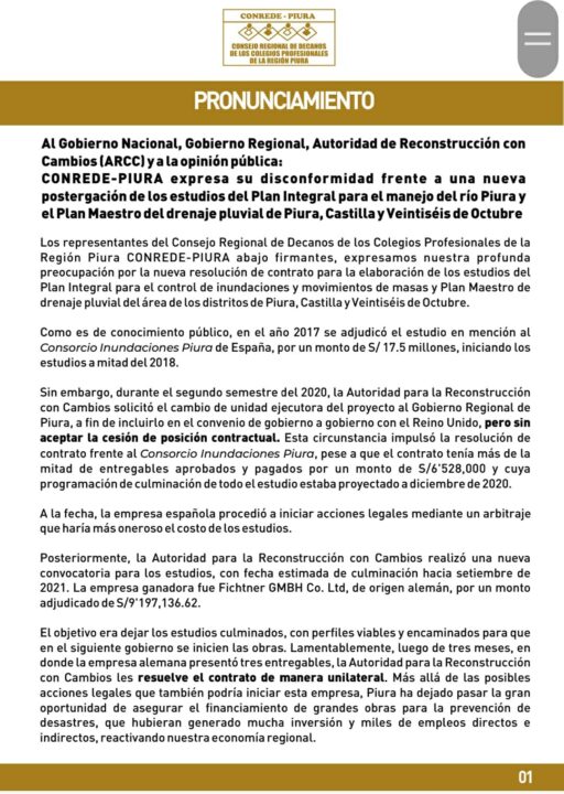 El Consejo Regional de Decanos de los Colegios Profesionales (CONREDE) de la Región Piura emitió un comunicado manifestando su disconformidad y preocupación frente a la nueva postergación de los estudios del Plan Integral para el manejo del río Piura y del Plan Maestro del drenaje pluvial de Piura, Castilla y Veintiséis de Octubre.