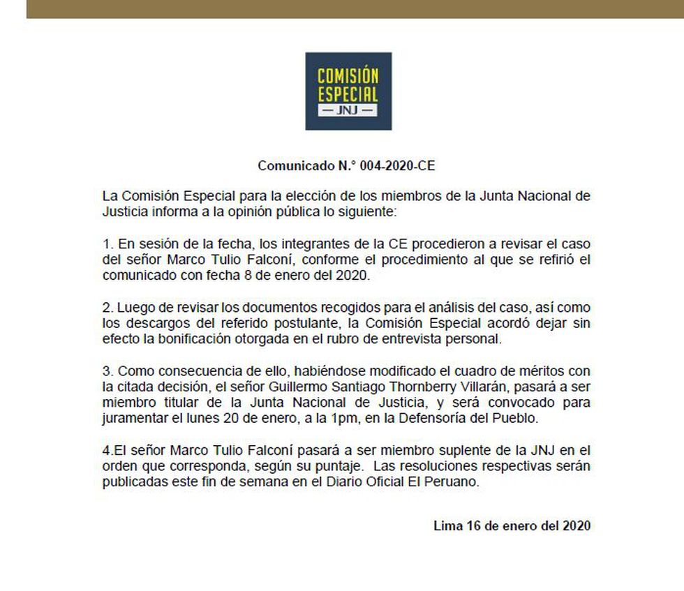 De acuerdo a Canal N, a Marco Falconí se le retiró el 10 % de bonificación que recibió en el concurso para ser parte de la JNJ. Con la reducción mencionada, pasa a ser miembro suplente de la JNJ.