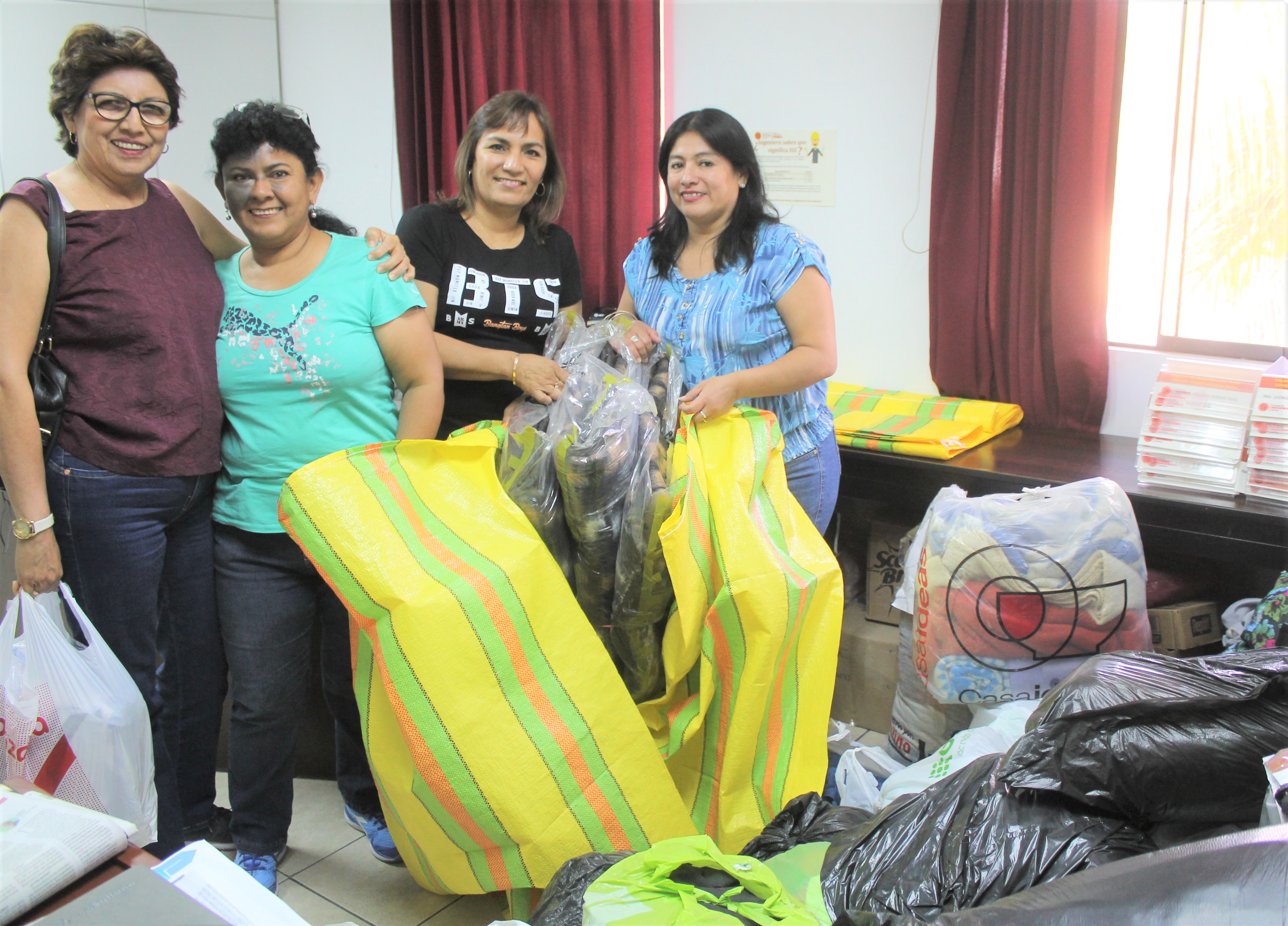 Susana Parra e integrantes del Comité de Damas iniciaron el trabajo de acopio y ordenamiento de las prendas de vestir (chompas, casacas, pantalones, gorros, medias), así como frazadas, mantas, zapatos, medicamentos, entre otros donativos, colocándolos en sacas para el respectivo envío.