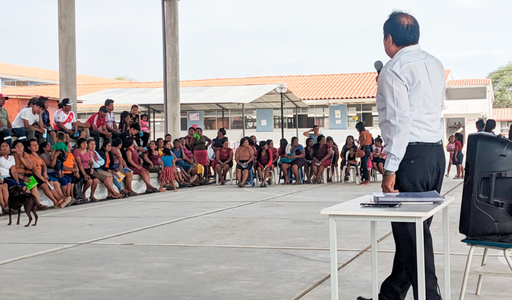 Jefe de área de UGEL Tambogrande, Prof. Roberto Quispe explicando su ponencia a los padres de familia