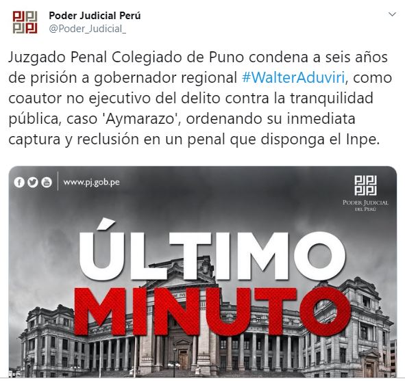 El Juzgado Penal Colegiado de Puno condenó a seis años de prisión efectiva al gobernador regional de Puno, Walter Aduviri Calisaya, como coautor no ejecutivo del delito contra la tranquilidad pública, en la modalidad de disturbios, durante la protesta denominada el ‘Aymarazo’, ocurrida en el 2011.