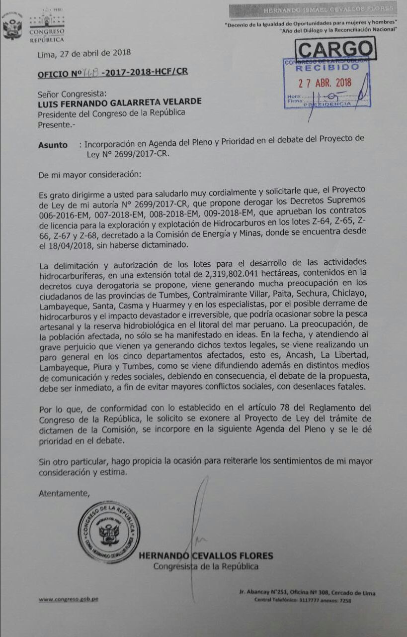 A través del oficio N° 768-2017, Cevallos solicitó dar prioridad al proyecto de ley N° 2699, que propone derogar los decretos 006-2016, 007-2018, 008-2018 y 009-2018, que aprueba los contratos de licencia para la exploración y explotación de hidrocarburos en los lotes Z-64, Z-65, Z-66, Z-67 y Z-68.