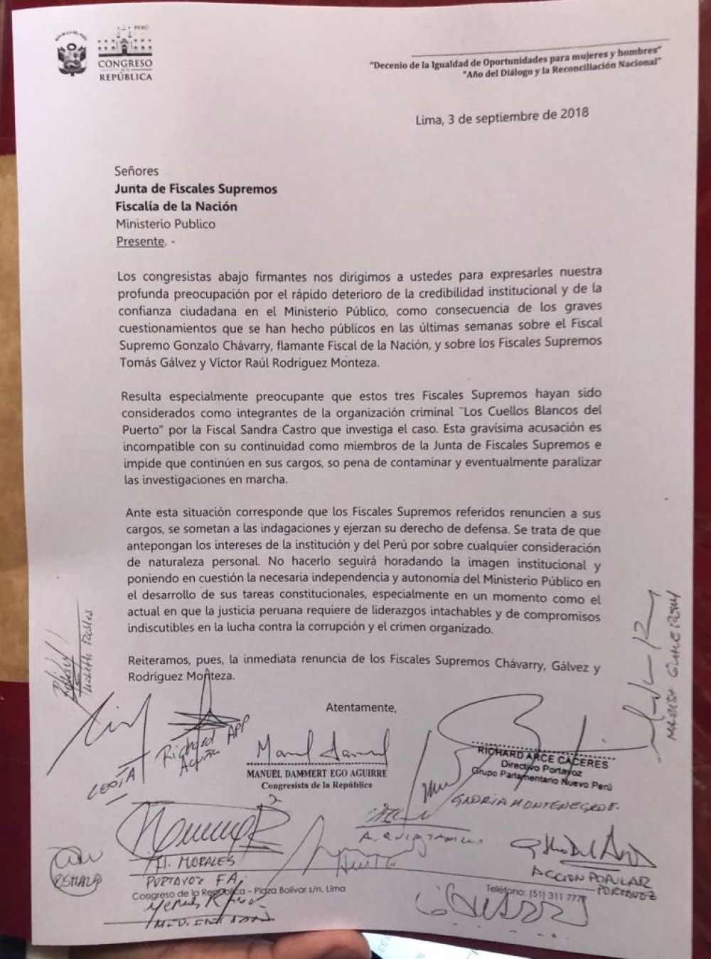 Congresistas de distintas bancadas presentaron ante el Ministerio Público una carta multipartidaria exigiendo la renuncia del fiscal de la Nación, Pedro Chávarry, así como de los fiscales supremos Tomás Gálvez y Víctor Rodríguez Monteza.