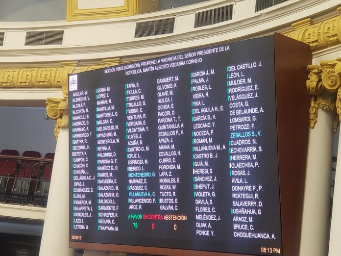 En una sesión extraordinaria, el Congreso de la República aprobó el pedido de vacancia al Ejecutivo con 78 votos a favor, 0 abstenciones y 0 en contra por incapacidad moral, a pesar de que sus funciones quedaron inhabilitadas.