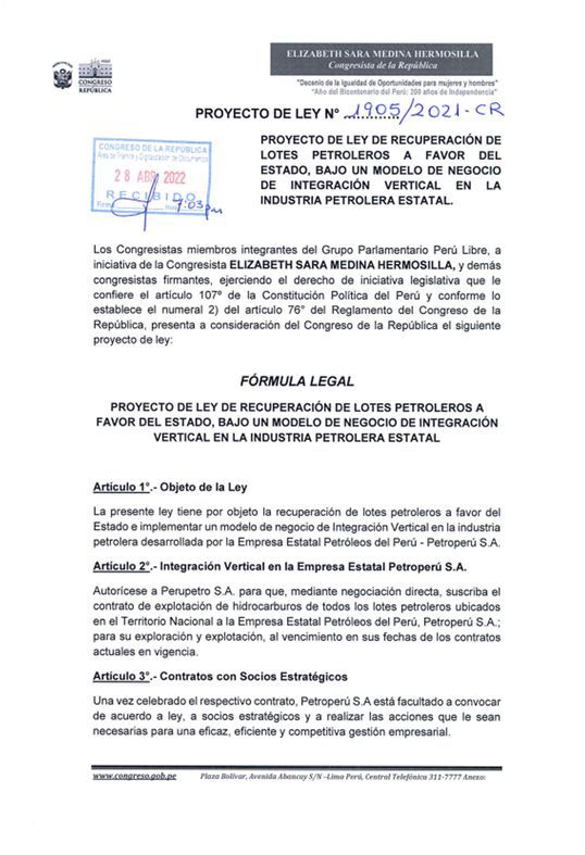 El proyecto de ley N° 1905/2021-CR de Perú Libre, con las rúbricas de los congresistas Alex Paredes, Américo Gonza, Silvana Robles, Wilson Quispe, Flavio Cruz y Margot Palacios, plantea que, mediante “negociación directa”, Perupetro conceda todos los lotes petroleros ubicados en el territorio nacional a Petroperú, para que pueda explorarlos y explotarlos al vencimiento en sus fechas de los contratos actuales en vigencia.
