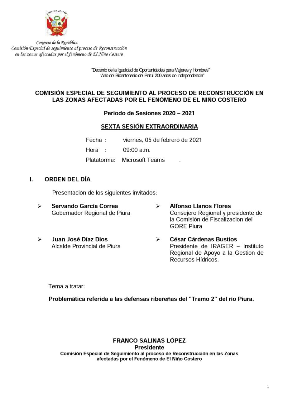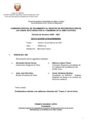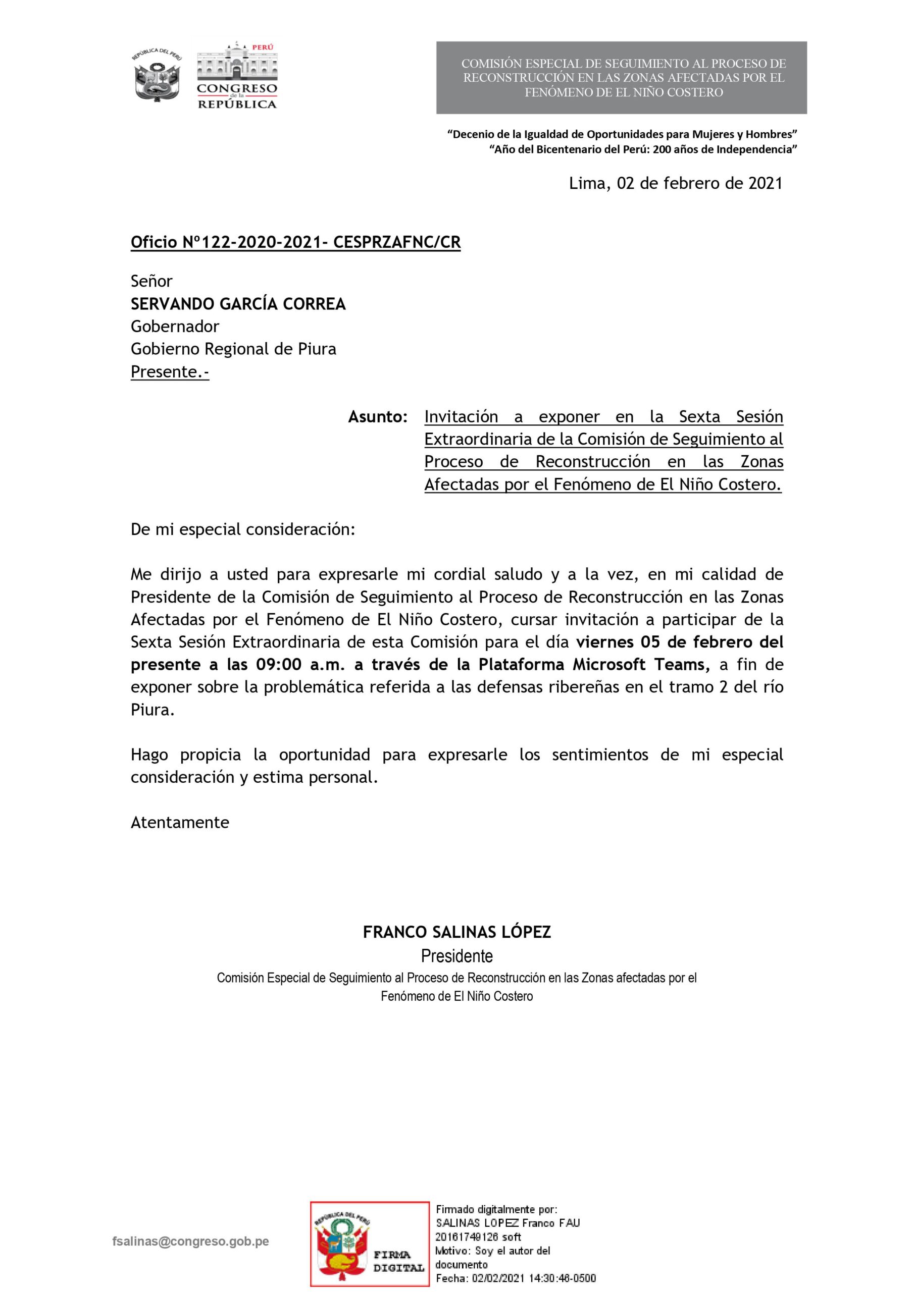 El congresista y presidente de la  Comisión Especial de Seguimiento de Reconstrucción, Franco Salinas López, hizo oficial la invitación al Gobierno Regional de Piura para la Sexta Sesión Extraordinaria, que se llevará a cabo, de manera virtual, este viernes 05 de febrero a las 9:00 a.m.