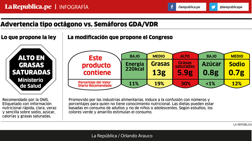 Sin embargo, el dictamen de modificación de la ley que se debatirá en los próximos días elimina estas etiquetas y las reemplaza por los semáforos de Guías Diarias Alimentarias (GDA) y Valores Diarios Recomendados (VDR) utilizado por la industria.
