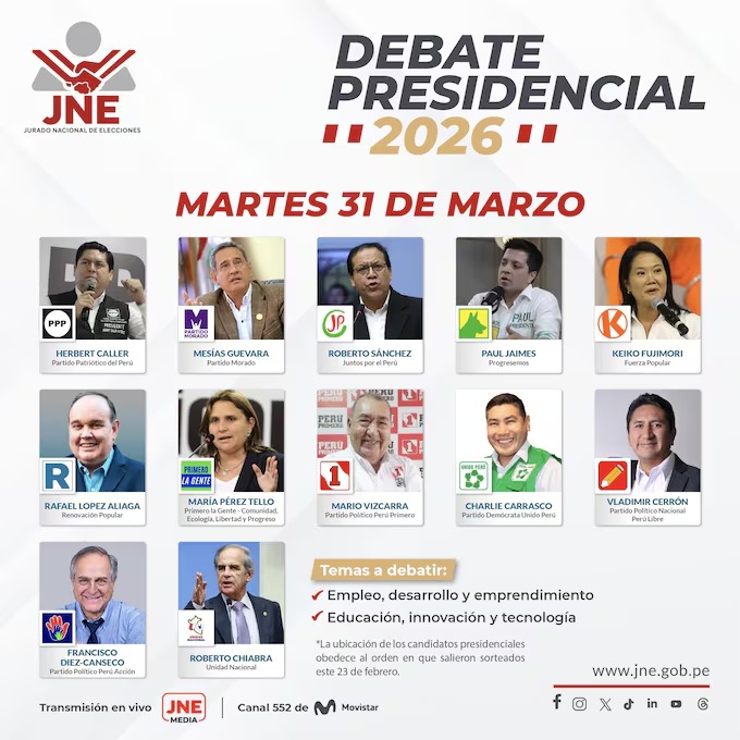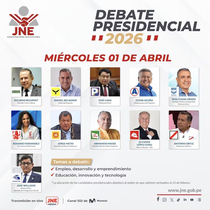 Se sabe que el debate será transmitido a través de la plataforma oficial del JNE y diversos medios de comunicación, permitiendo que millones de peruanos accedan a las propuestas de los candidatos antes de emitir su voto.