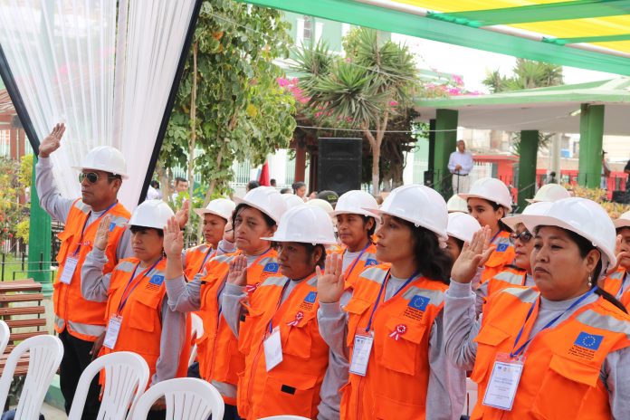 Luego de haber finalizado el proceso de capacitación y posteriormente haber recibido los kits de brigadistas, los participantes del proyecto “Vamos Piuranos” financiado por la Oficina de Ayuda Humanitaria de la Unión Europea, fueron juramentados el 17 de julio de 2019, como brigadistas comunitarios por el Consorcio Care, Coopi y Cutivalú, con el respaldo de las autoridades locales en la Plaza de Armas del distrito de Catacaos.