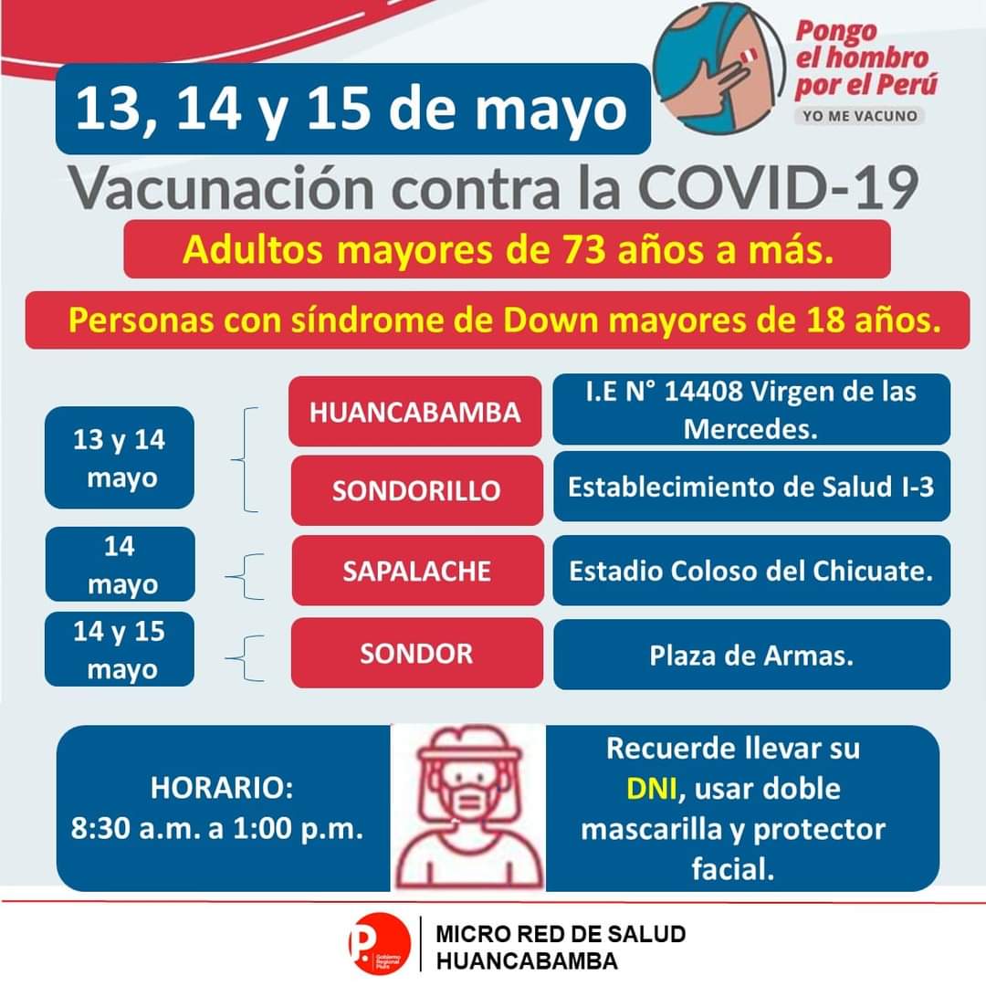 El 13, 14 y 15 de mayo continúa la vacunación para adultos mayores de 73 años en los distritos de Huancabamba, Sondor, Sondorillo, y en Sapalache (Carmen de la Frontera). Además, el personal de salud también inmunizará a las personas con discapacidad o síndrome de down mayores de 18 años.