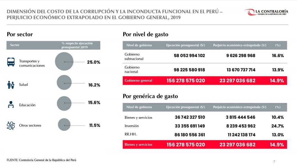 La Contraloría General de la República presentó el estudio “Cálculo del tamaño de la corrupción y la inconducta funcional en el Perú”, donde revela las pérdidas económicas durante el 2019 como resultado de los actos de corrupción cometidos en las diferentes instituciones del Estado.