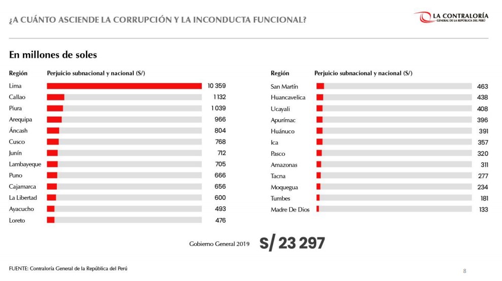 El contralor general Nelson Shack, durante la presentación del informe realizada esta mañana, indicó que las regiones con mayor perjuicio por corrupción en 2019 son Lima (S/10 359 millones), y Callao (S/1132 millones). La región Piura aparece en el tercer lugar con 1 039 millones de soles, les sigue Arequipa (S/966 millones) y Áncash (S/804 millones).