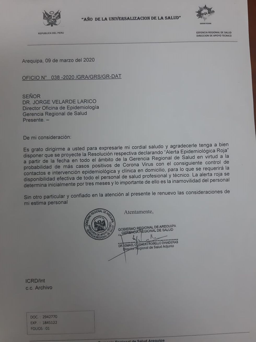 El documento que solicita que se disponga las medidas de alerta fue enviado por Ismael Cornejo Rosello Dianderas, director regional de Salud Adjunto.