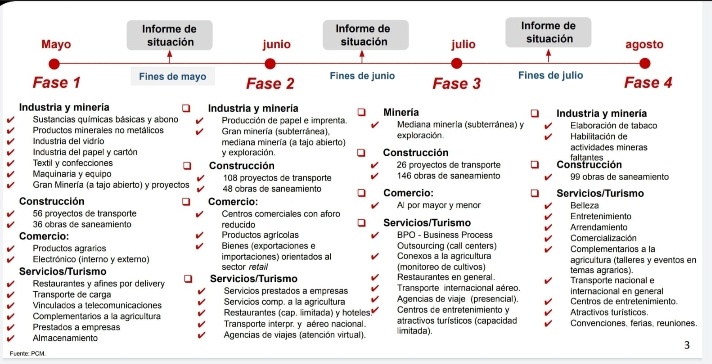 Para la primera fase, durante el mes de mayo, el Gobierno autorizó el reinicio de 27 actividades económicas, entre las cuales se ha considerado a la minería e industria, construcción, servicios y turismo, y comercio.