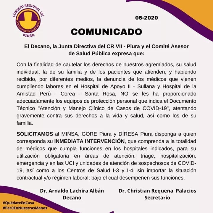 El decano del Colegio Médico de Piura (CMP), Arnaldo Lachira Albán, a través de un comunicado, denunció que los profesionales que atienden en los hospitales de Sullana de Apoyo II y Santa Rosa no han recibido la indumentaria y equipos de protección para prevenir el contagio entre los trabajadores de salud.
