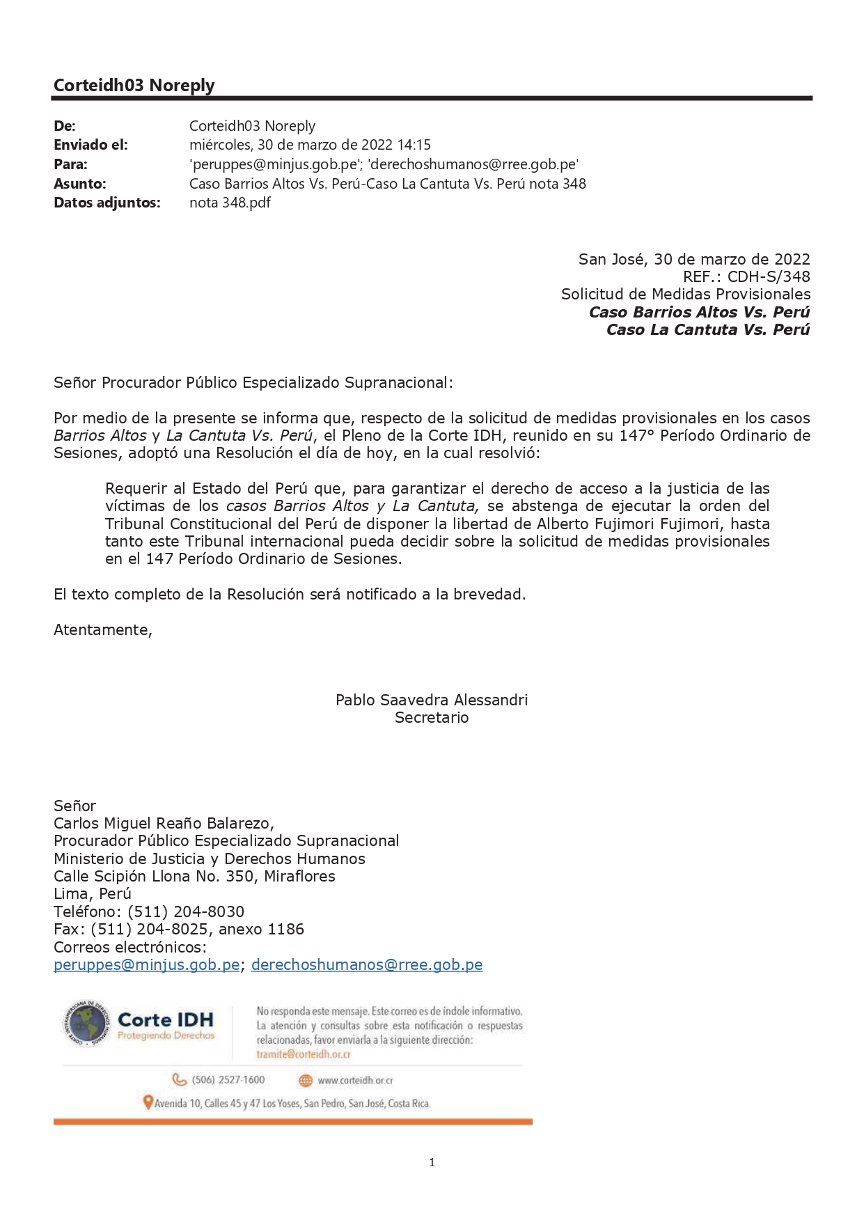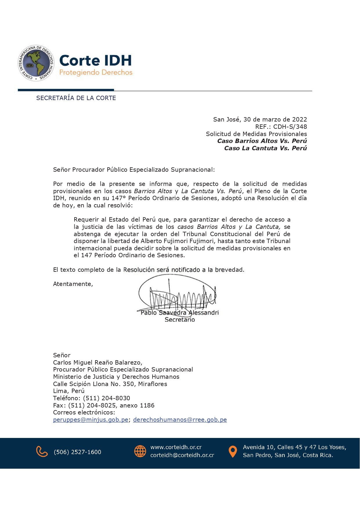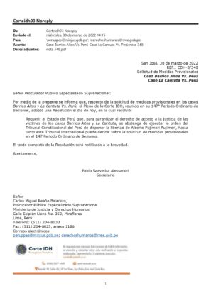 “El pleno de la Corte IDH decidió el día de hoy (miércoles 30 de marzo) requerir al Estado peruano que, para garantizar el derecho de acceso a la justicia de las víctimas de los casos Barrios Altos y La Cantuta, abstenerse de ejecutar la decisión del Tribunal Constitucional que ordena liberar a Alberto Fujimori Fujimori”, se lee en el documento emitido por el órgano internacional.