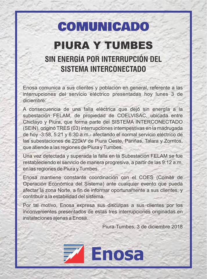A través de un comunicado, ENOSA informó que fueron tres interrupciones del servicio que afectaron los distritos de Piura, Castilla, Veintiséis de Octubre, Pariñas, Talara, Santo Domingo, Sapillica, entre otros.